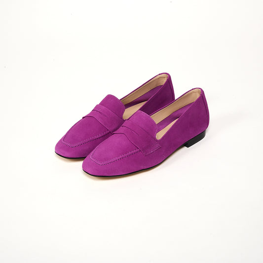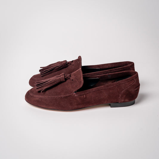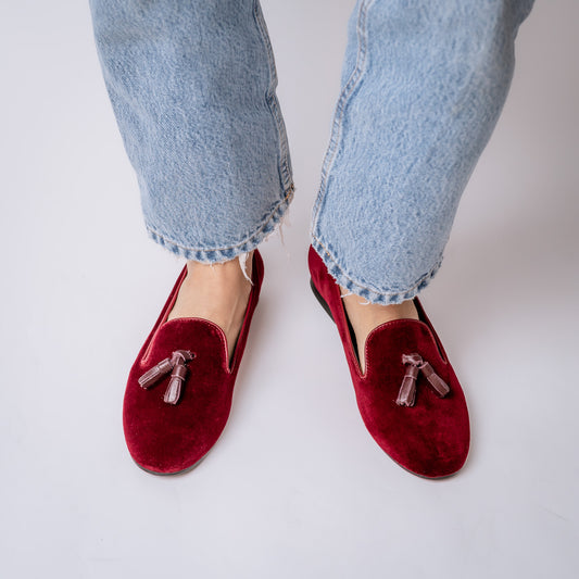 MOCASÍN TERCIOPELO CON POMPON CUERO BURDEO