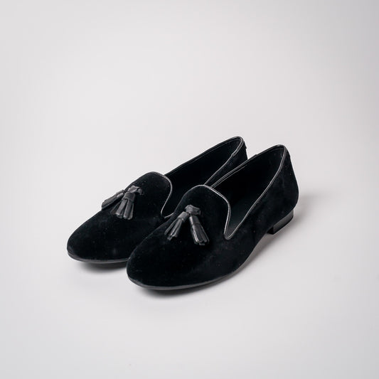 MOCASÍN TERCIOPELO CON POMPON CUERO NEGRO