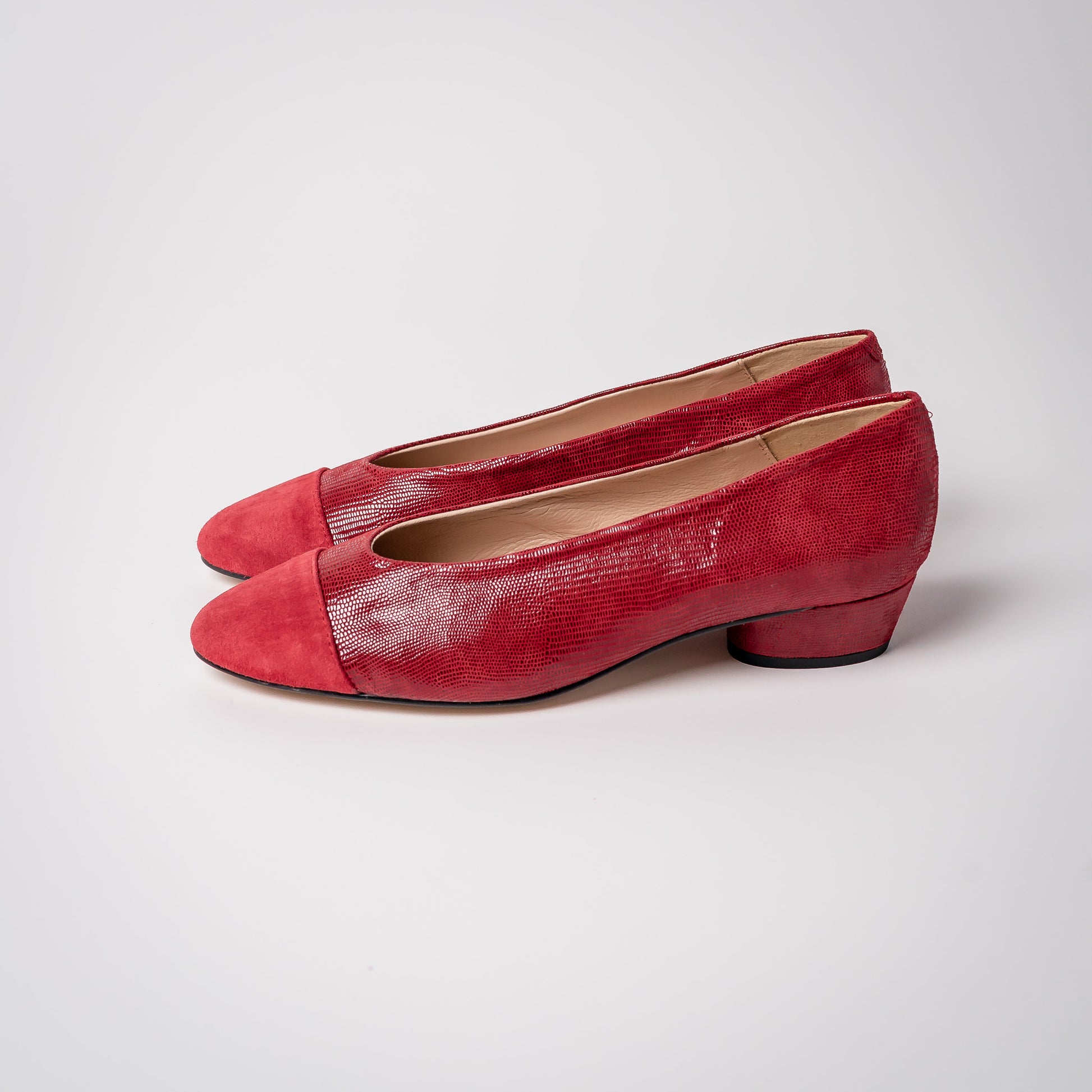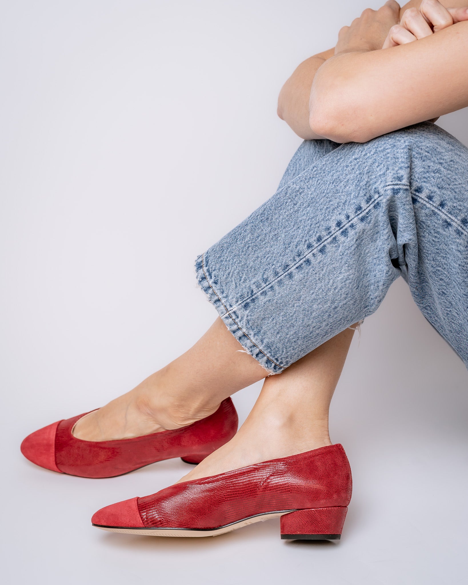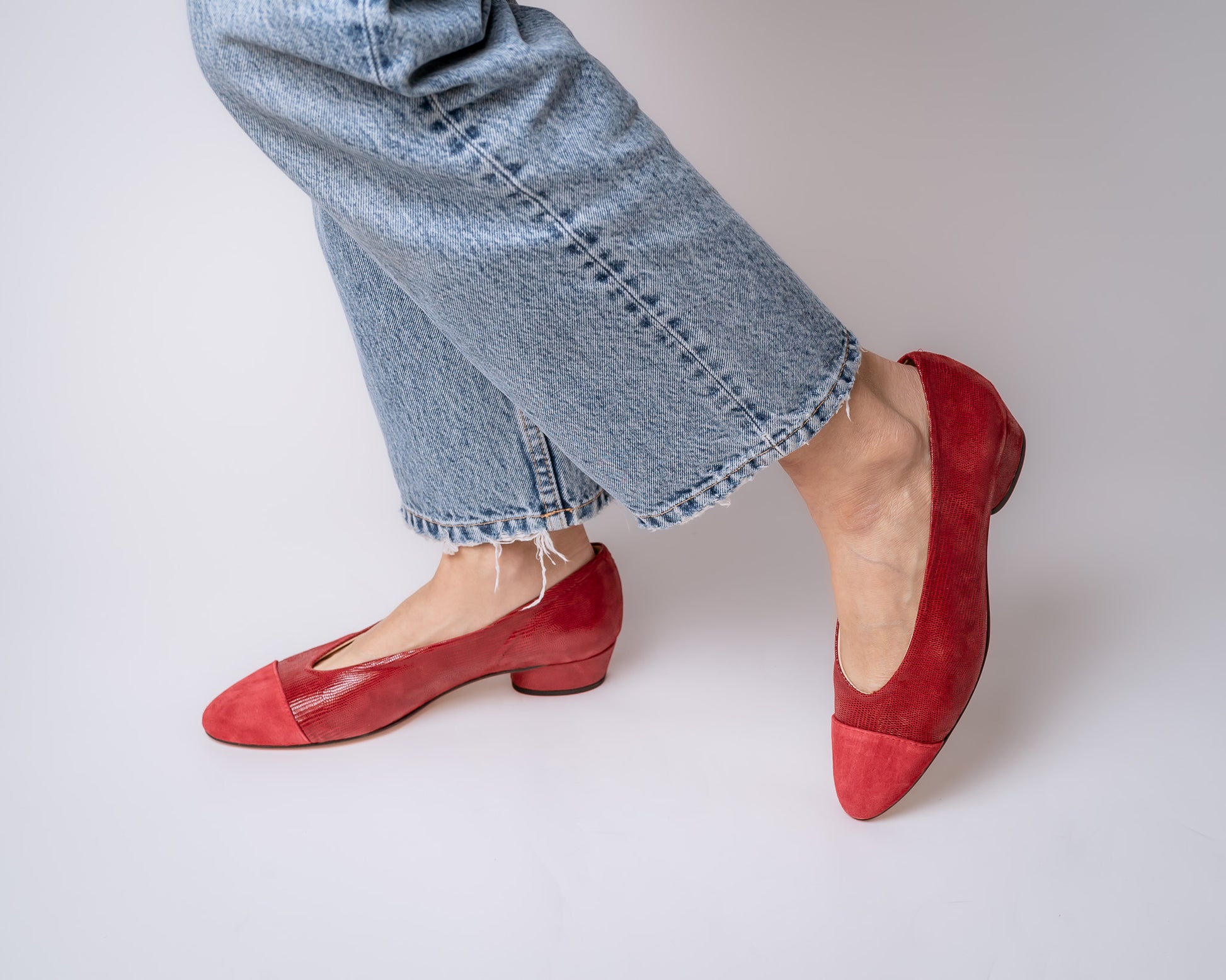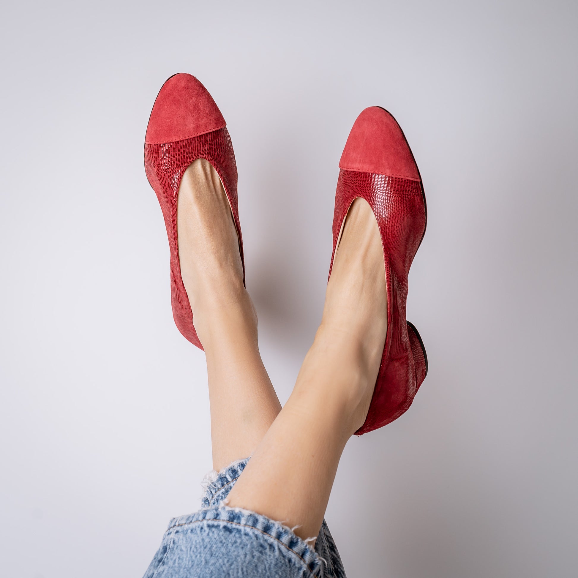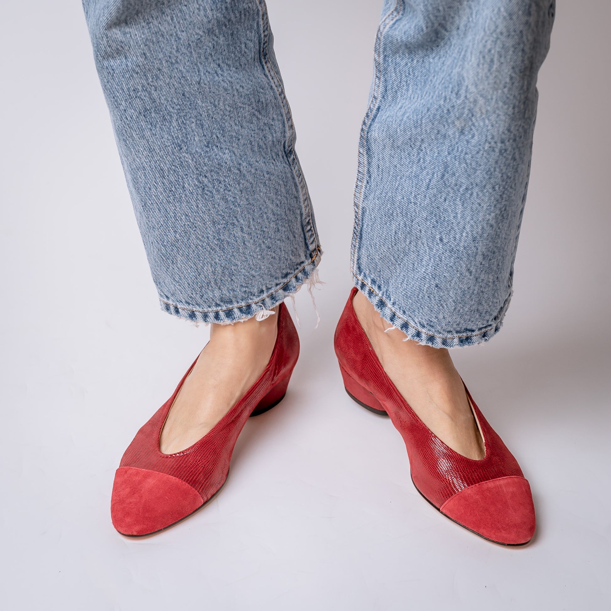 Bailarina bicolor con escote en U, cuero rojo grabado con punta gamuza roja, forro interior cuero, tacon 3 cm, suela cuero antideslizante. Es perfecta para el día a día, puedes usarlas tanto de día como de noche. Atemporal y clásica, elevará cualquier tenida.